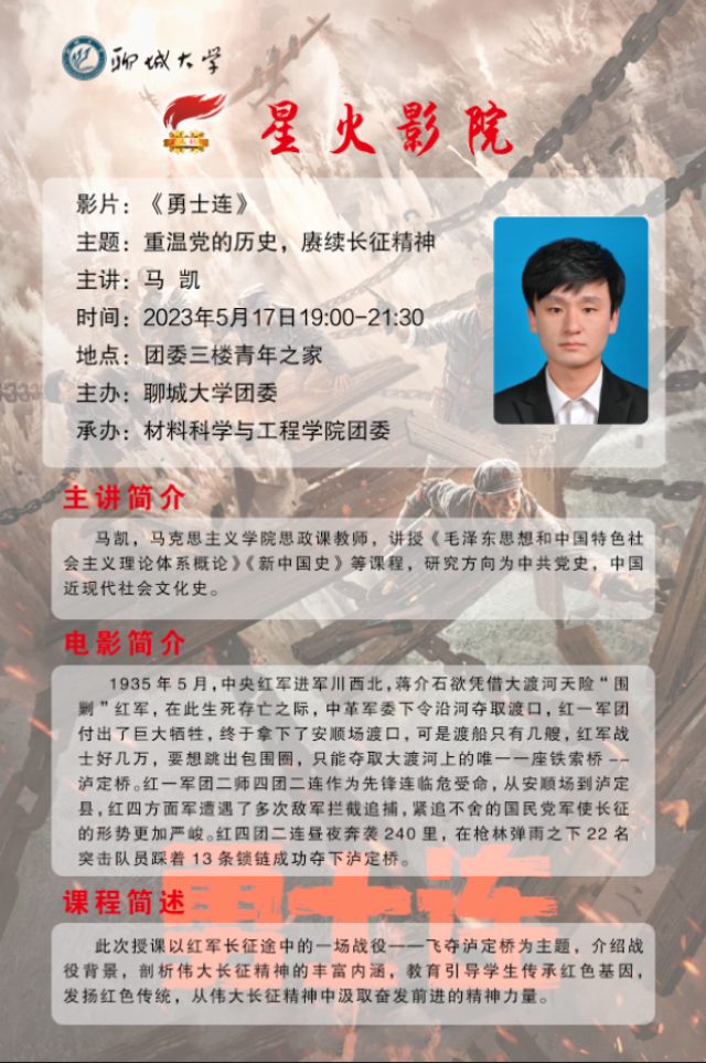 聆听红色故事、品鉴红色影片、传承红色基因、争做红色传人。2023年5月17日,聊城大学材料科学与工程学院于东校区实验实训楼报告厅举办“星火影院”观影活动。本次活动观看的影片是《勇士连》,特邀马克思主义学院思政课教师马凯老师担任主讲嘉宾,马老师讲授的微党课题目是《重温党的历史,赓续长征精神》。