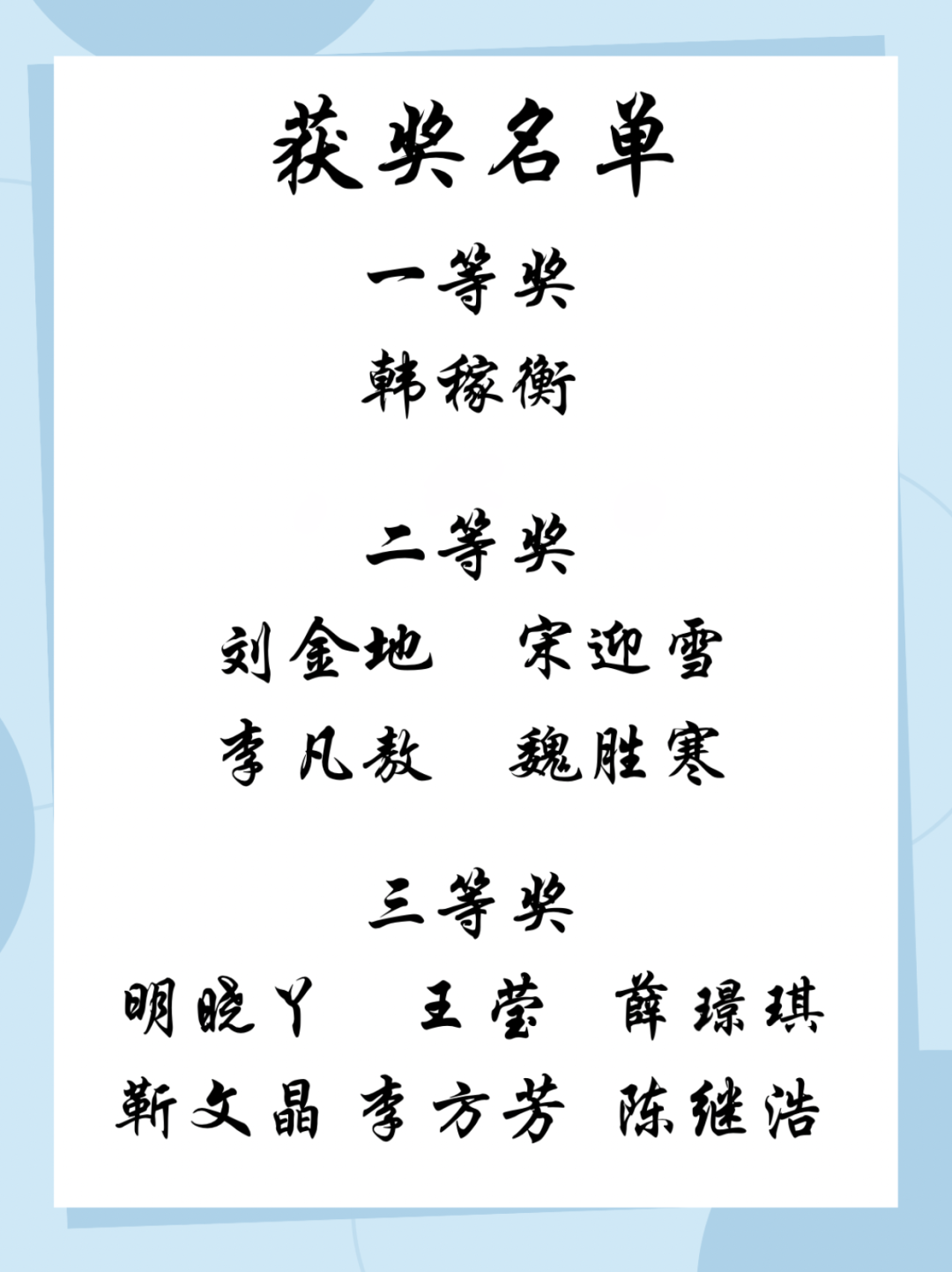 本次活动中,评审团本着公平公正的原则,严格按照评判标准评选出一等奖1名,二等奖4名,三等奖6名。本次活动充分锻炼了同学们动手能力以及创新思维,加强了宿舍成员的交流,增强了宿舍的凝聚力,进一步推动物理科学与信息工程学院宿舍文化建设,巩固文明宿舍创建成果。