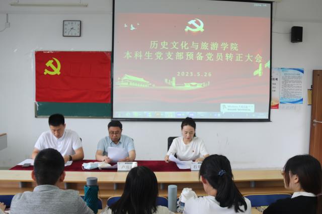 为进一步发挥基层党组织的先锋模范作用,落实党支部发展党员工作,5月26日,历史文化与旅游学院于6#A405召开本科生党支部预备党员转正大会暨预备党员宣誓大会。本次大会由本科生党支部书记石晓晗主持,学院党委副书记卢庆洪,辅导员辛超出席会议,党支部12名正式党员,47名预备党员及15名拟转正人员参与会议。