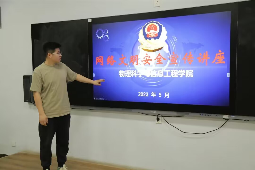 为进一步增强学生自觉抵御网上不良信息的意识,向学生普及网络文明安全知识,提高学生网络安全文明素养,筑牢校园网络文明安全,5月30日,物理科学与信息工程学院于西校区十号楼C220召开网络文明安全专题宣讲会,2021和2022级全体学生通过易班直播进行观看,物理科学与信息工程学院通信工程系本科学生党支部杨龙越为本次宣讲的主讲人。