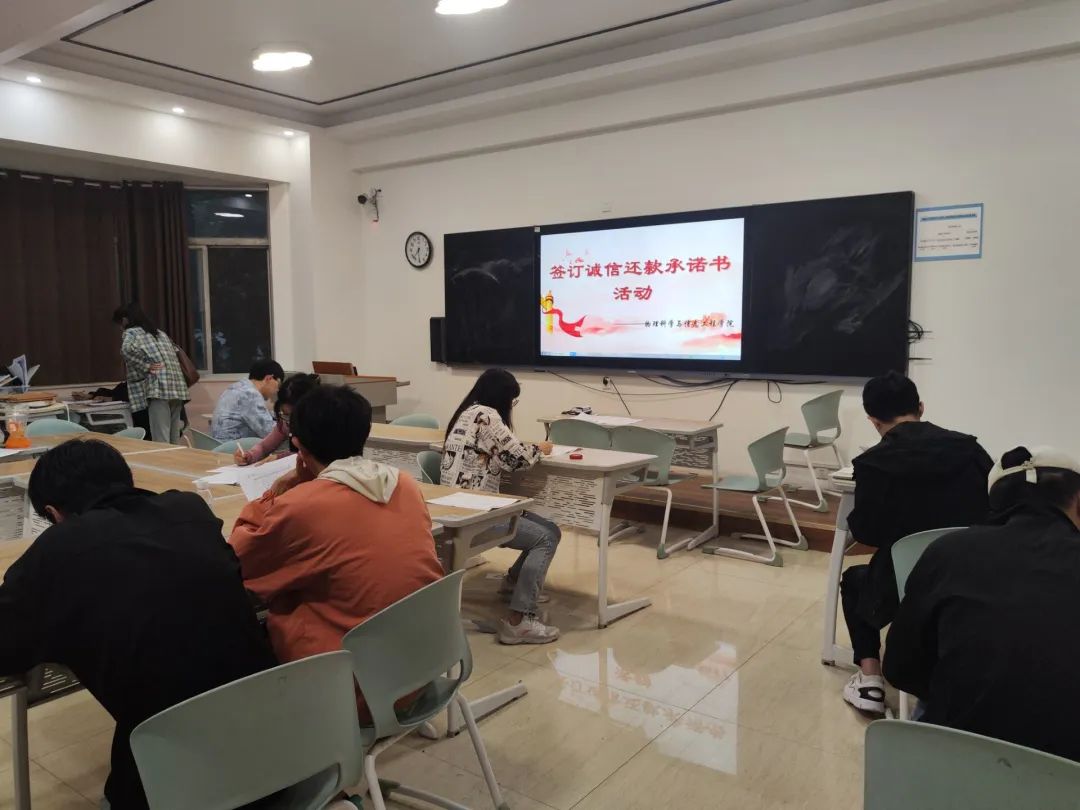 最后,组织人员向毕业生发放《诚信还款承诺书》,组织本院贷款毕业生认真阅读,分批有序地进行诚信签名。在场毕业生纷纷承诺“内诚于心,外信于人;按期还款,绝不违约”。组织人员也代表学院对贷款毕业生送出温暖寄语,鼓励同学们以诚信为尺来衡量自我。
