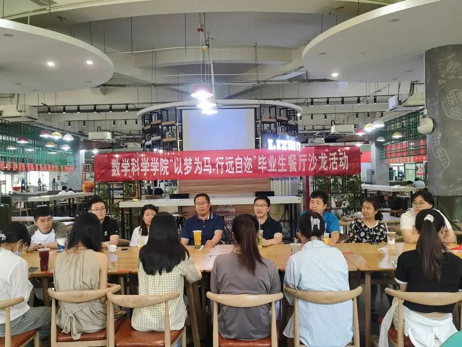 5月31日,数学科学学院于湖苑餐厅一楼举办“以梦为马,行远自弥”毕业生餐厅沙龙活动,数学科学学院副院长夏建伟,副院长赵军圣,团委书记岳琳琳、毕业班班主任刘文健、辅导员张晓冬、范海燕、姚三乐、李浩以及2019级毕业生代表参加此次活动。