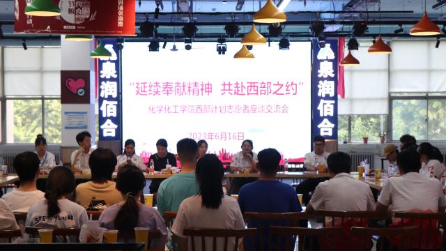 青春之志向边疆,奉献之心报祖国。为加强西部计划志愿者的思想引领工作,进一步激发志愿者为国奉献的奋进力量,强化志愿者投身西部的责任担当,6月16日,化学化工学院于翰苑餐厅二楼举办“延续奉献精神,共赴西部之约”西部计划志愿者座谈交流会,学院党委副书记、副院长段艳林,往届西部计划志愿者代表、2023届西部计划志愿者以及部分学生干部参加本次会议,会议由学院辅导员贾云超主持。