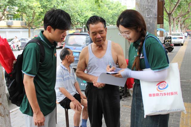 服务队通过走访和问卷调查的方式对外来务工、当地村民、基层干部等人群的普通话使用情况进行调查,了解当地国家通用语言文字普及程度和质量情况,重点人群国家通用语言文字使用状况、学习状况和学习需求等,据此拟定更加符合实际的实践计划。服务队成员走向街头,他们一边进行问卷调查,了解当地普通话普及程度,一边普及普通话知识,让当地村民了解“他们的话”和普通话之间的些微差别,从而更好地开展普通话推广工作,服务铸牢中华民族共同体意识,在助力乡村振兴战略中贡献青春力量。