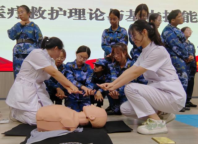 立其身而立其国,授之技以授之志。军训如火如荼地进行,训练科目不断丰富,战地医疗救护理论与基本技能培训科目成为面向全校的重要课程。培训现场,“医”心向阳志愿服务队成员使用模拟人为同学们进行理论讲解与实际操作,向大家生动形象的展示心肺复苏的重要步骤。新生们聚精会神,积极响应服务队成员的展示工作与实践号召,有序上台进行实操。服务队成员们在一旁细心纠正同学们出现的问题,并针对易错内容进行总结并重点学习。同学们基本了解了应急救护知识,提高了应对突发灾难和意外伤害的自救与互救能力。