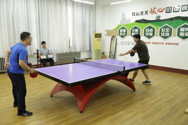 数学科学学院党委书记刘德芳和物理科学与信息工程学院党委书记高金华首轮对战,瞬间点燃现场激情。赛场上,双方队员在精彩对打、机智轻吊、直板横打、攻球扣杀中将国球的魅力和泰山学者的精神展现的淋漓尽致。