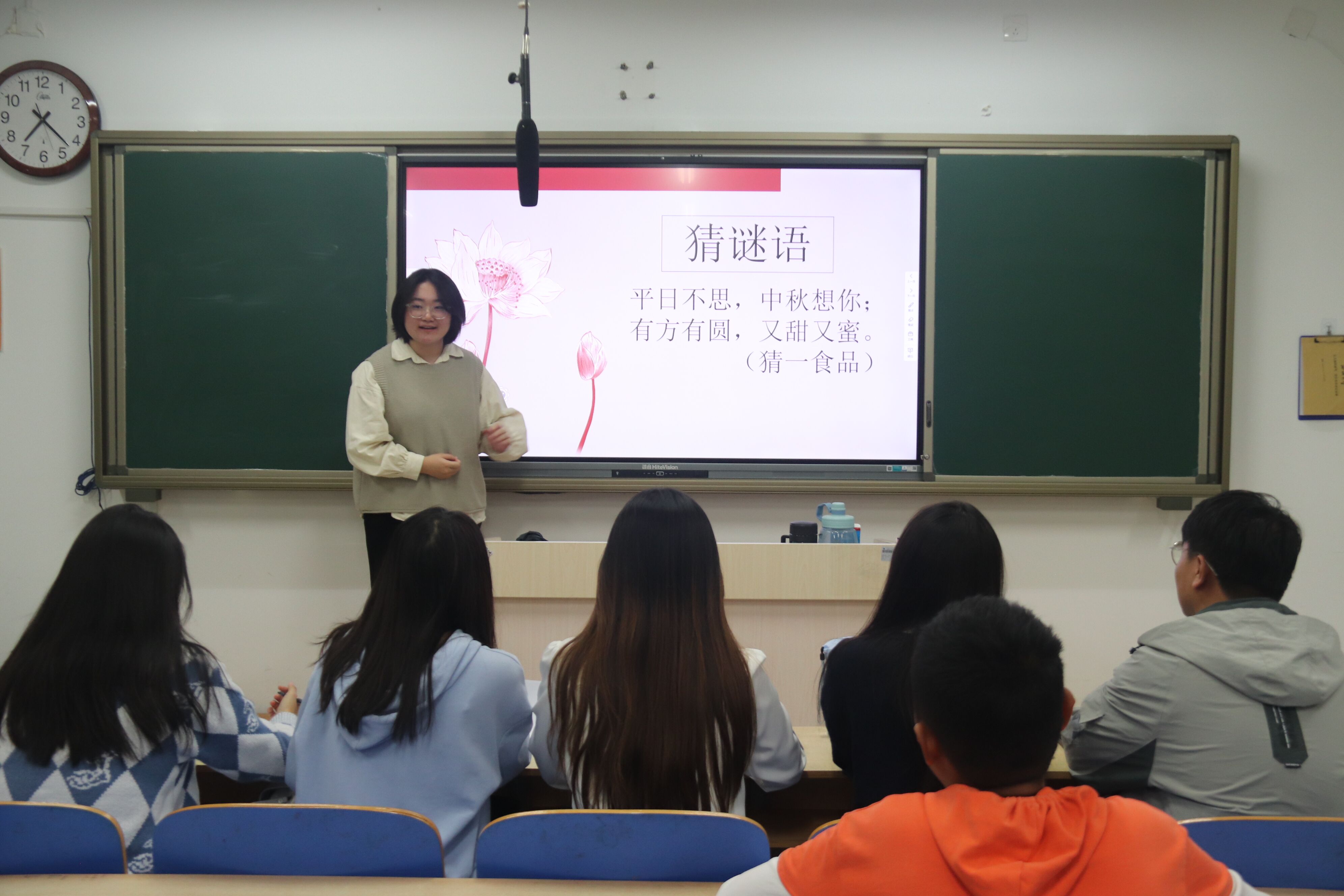 一起走进经典,一起感受经典。本次比赛采用百分制进行评判,参赛选手以讲课方式营造课堂情景,讲述“中华优秀传统文化”的相关内容。草书飘逸、行书流畅、正楷端庄。苏沛禹同学从汉字的起源、种类等方面简述了汉字源远流长的历史故事,并结合当代提笔忘字的现象,提醒同学们要深刻意识到理解汉语言文化底蕴,重拾汉字之美的重要性。张聿叶同学准备充分,思路清晰,以汉服的概念为切入点,从汉服的文化内涵、基本形制和审美意蕴入手,带领同学们一起走进汉服的世界,领略汉服的变迁与传承。黄永琰同学从节日灯谜引入,以轻松自如的教态和富有感染力的语言,围绕“中国传统节日”的现状,引发同学们对节日淡化的思考,并呼吁同学们树立正确的文化价值观,全面认识中西方节日。比赛过程中,选手们逻辑严密,语言生动,内容丰富,充分展现出课堂的无穷魅力,赢得同学们的阵阵掌声。随后,丁伟同学的《打铁花》亮点频出,不仅打动了评委,更让同学们进一步接触到非遗知识,深刻感受着千百年文化的传承与浪漫。经过激烈的比拼,每位同学都展现出不同的讲课风格和对传统文化的热爱,其中,黄永琰、张聿叶同学成功进入决赛。