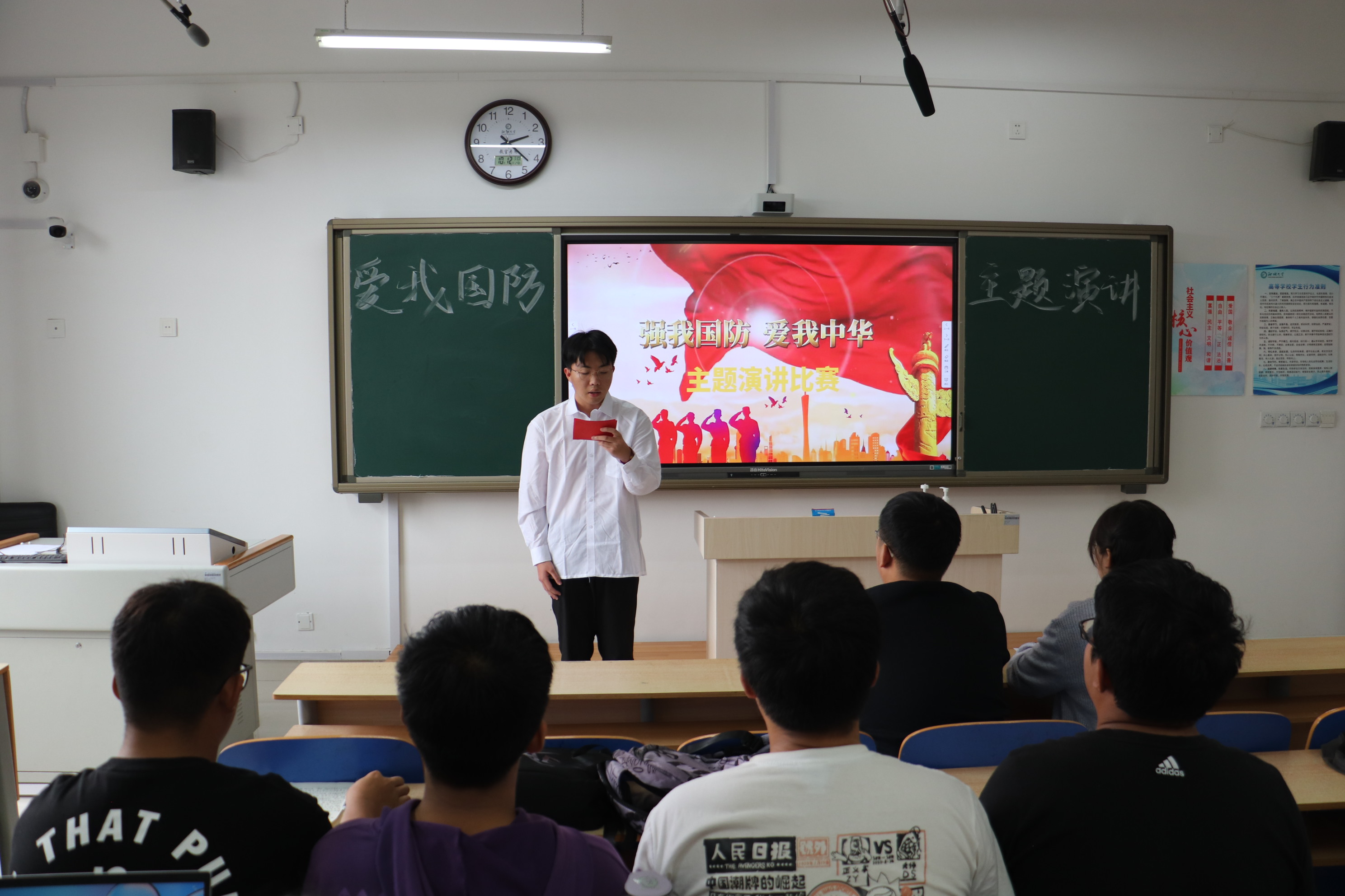 为帮助同学们了解国防知识、培塑国防观念、掌握国防技能,进而激发同学们关心国防、热爱国防、建设国防、保卫国防的政治热情和行动自觉,10月12日,历史文化与旅游学院于6#A403教室举办“爱我国防”主题演讲大赛初赛。本次比赛邀请学生干部孙孟轩、翟羽佳担任评委。