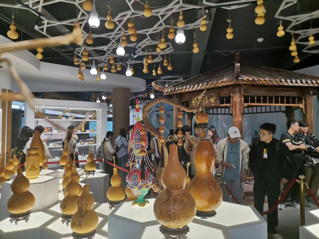 全体同学在学校东门集合,集中乘坐大巴车赶往第十五届中国江北水城·两河明珠(聊城)葫芦文化艺术节举办现场——聊城中华葫芦文化园。乘车途中,班主任许利老师向同学们讲述了聊城黄河文化、运河文化等地方特色文化和文旅品牌,增加同学们对本次活动的了解和认识。活动中,同学们参观了葫芦产品展销活动,来自来自北京、天津、辽宁、河北、云南等17个省(自治区、直辖市)的5000余家葫芦商户带来了各种款式和加工工艺的葫芦让同学们大饱眼福。展销现场,同学们同东昌葫芦雕刻技艺省级非遗项目传承人王树峰进行交流。王树峰结合自己求师学艺的亲身经历,告诉同学们“传统是根,创新是魂,守正创新方能行稳致远”,大家深受感染。之后,同学们还参观了“鲁西记忆”——聊城民居民俗展,体验鲁西民俗、田园风情。11:20同学们一起参观了中国葫芦文化博物馆,详细了解千年葫芦文化的博大精深和非遗技艺的精巧绝伦的,深刻感受葫芦文化之乡东昌府的独特魅力。在博物馆里同学们欣赏了各式各样的精美藏品,了解到葫芦的种类有瓠子、瓠瓜、亚腰葫芦、扁圆葫芦、长柄葫芦等,葫芦的加工工艺有火画葫芦、范制葫芦、扎葫芦、雕刻葫芦、针划葫芦、押花葫芦等。葫芦代表“福禄”,寄托着人们对美好生活的期许。