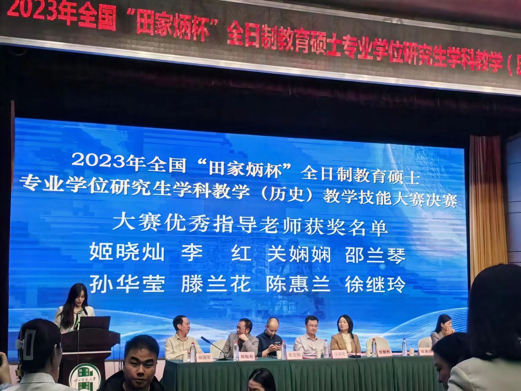 10月20-22日,2023年全国“田家炳杯”全日制教育硕士专业学位研究生学科教学(历史)专业教学技能大赛决赛在四川师范大学举行。来自全国76所院校的152名选手参加决赛,我校历史文化与旅游学院2名研究生参赛。其中,侯仙慧同学荣获一等奖,王滢同学荣获三等奖,李红老师获“优秀指导教师奖”。