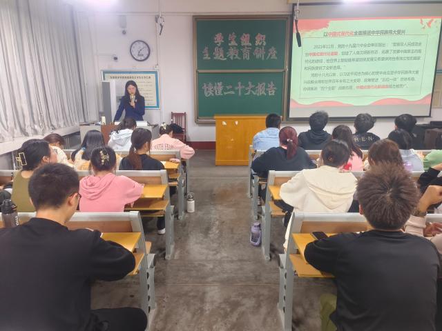 在60分钟的讲座中,王崇娟以党的二十大报告中提到的九个数字为切入点,围绕党的二十大的主题、意义以及过去五年工作和新时代十年伟大变革的重大意义等八个方面,对党的二十大精神进行了全面、系统、深入的解读辅导。讲座主线清晰、内容丰富、重点突出,理论解释与实践指导相融合,让全体学生干部对党的二十大主要精神有了更加深刻的理解和认识。王崇娟强调,作为新时代的青年,要深刻理解党的二十大报告的深刻内涵,立足本职,以身作则,带动学生群体整体素质的提升。讲座结束后,同学们纷纷表示,本次主题教育讲座内容丰富、思想深刻,作为学生干部,要坚定理想信念,敢想敢做,善做善成,以更高的标准要求自己,在日常工作中不断提升自己的能力和素质,为同学们服务,为学院发展贡献自己的力量。