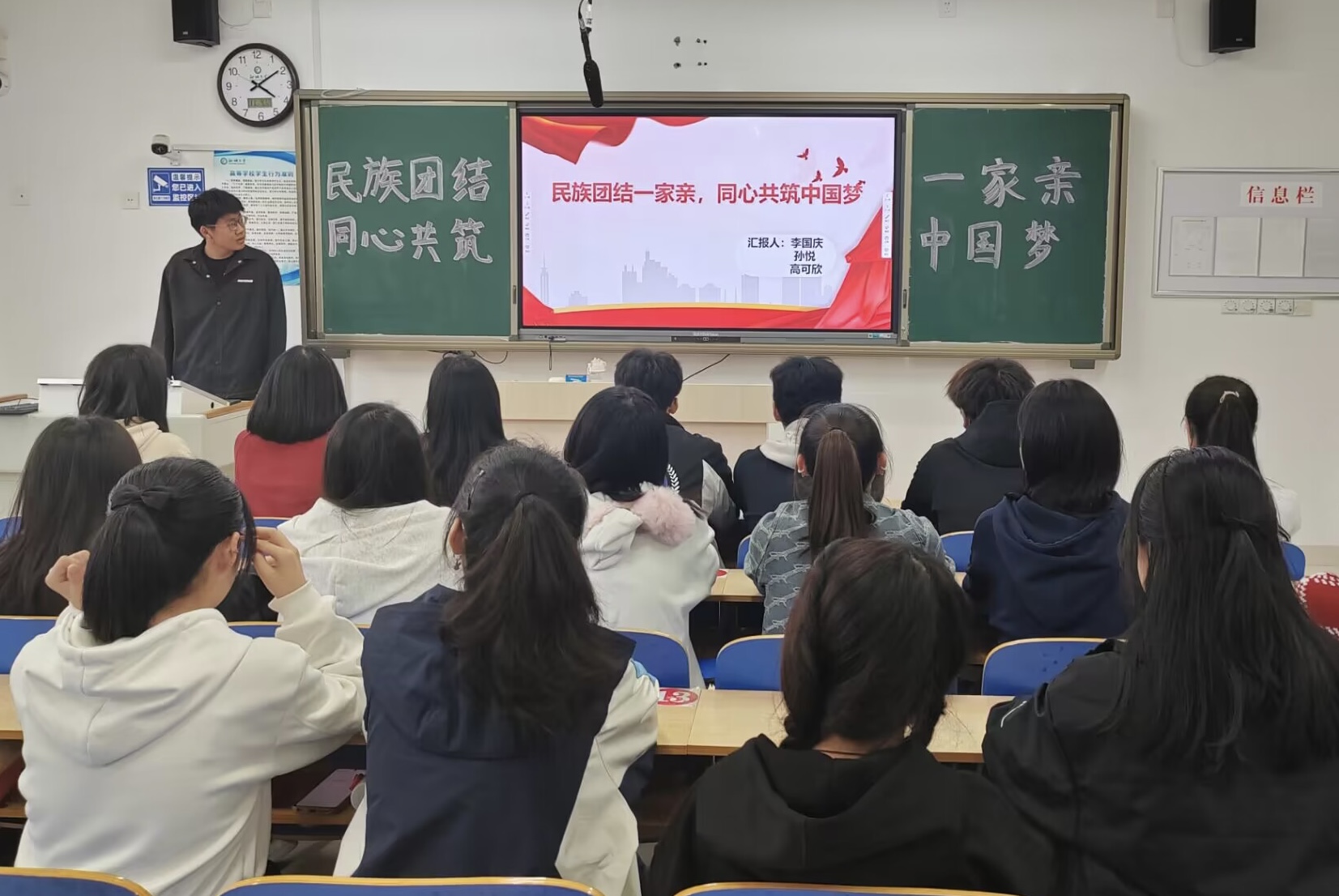 活动负责人李国庆先与同学们分享丰富多彩的民族故事,让同学们初步了解到少数民族的历史、传统和价值观念,又分别从民族交流、民族团结和民族文化三个维度介绍部分少数民族传统节日,如羌年、蜡染、赫哲族伊玛堪说唱等,让同学们更加深入了解民族文化特色。李国庆通过视频与文字图片相结合的方式着重介绍侗族大歌,让同学们更加切实感受到民族文化的魅力。在“看图猜猜猜”环节中,同学们积极参与互动,在活动中拓展了自己的文化视野,增强了民族文化认同感。接着,李国庆播放少数民族地区改革开放四十年跨越发展的相关视频,让同学们深刻感受到国家的繁荣发展,增强爱国主义情感。负责人孙悦呼吁同学们要深入了解少数民族特色文化,尊重和包容不同的文化,传承多样性文化。参与者谢仁齐表示,作为水族的一员,很高兴参加此次活动,并向同学们介绍马尾绣和水书等水族传统文化,今后要更好地学习和传播优秀的少数民族文化,促进不同民族之间的文化交流。