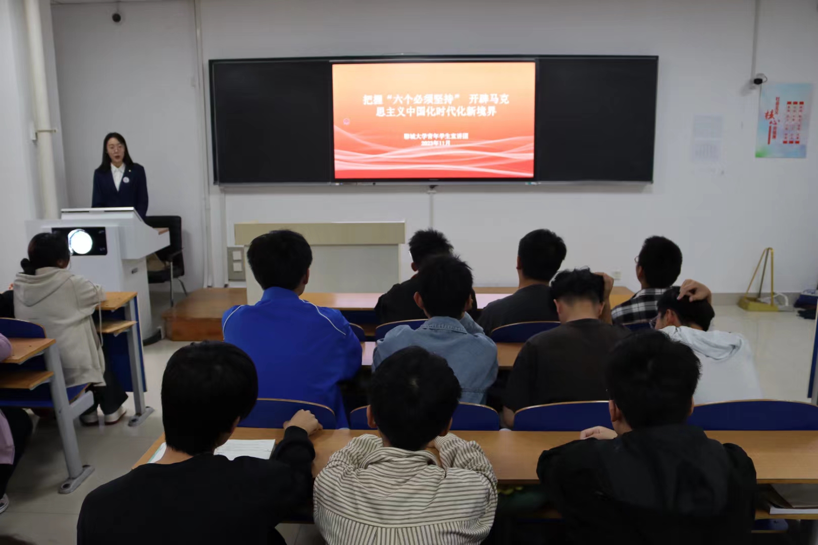 为认真领悟六个“必须坚持”的核心要义,增强学生的责任感与使命感,11月4日,聊城大学青年学生宣讲团于5#A401开展“把握六个必须坚持,开辟马克思主义中国化时代化新境界”思政课。