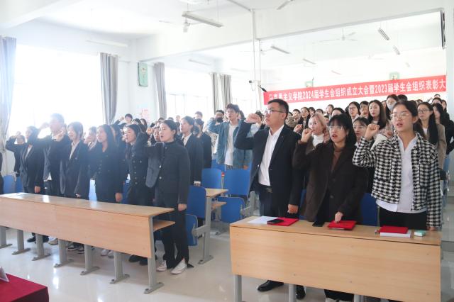 第六项,宣读《学生会干部自律公约》,由2024届研究生会、学生会主席团成员领誓,全体学生干部共同宣誓。大会在全体学生组织成员的铿锵宣誓中圆满落幕。