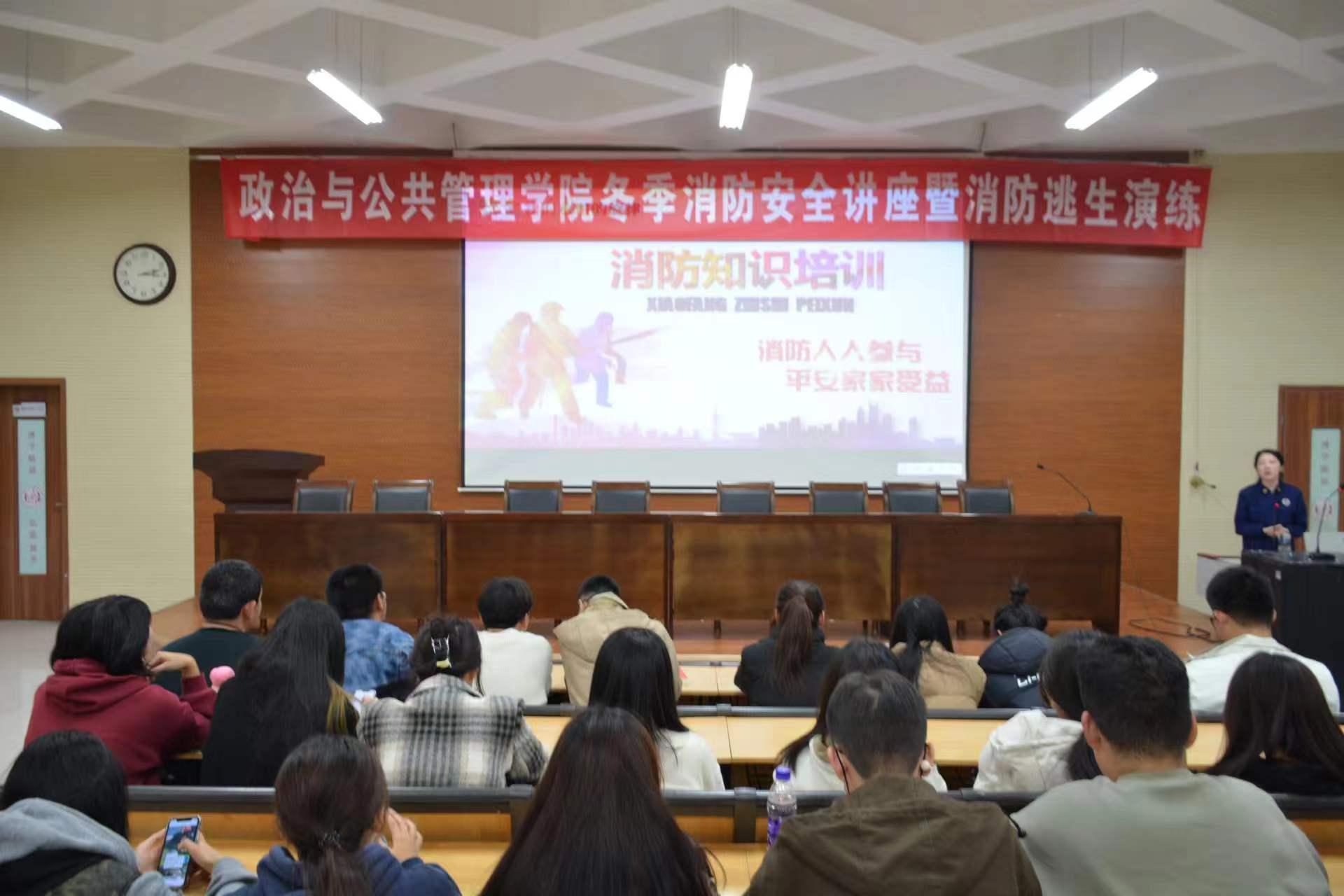 为响应消防安全宣传月活动号召,增强大学生消防安全意识,本着“预防为主,防消结合”的理念,11月18日,政治与公共管理学院于东校区6#C106举办“消防安全逃生演练”讲座活动。本次活动特邀聊城市消防局教官任宣讲人,政治与公共管理学院2023级全体学生参加。