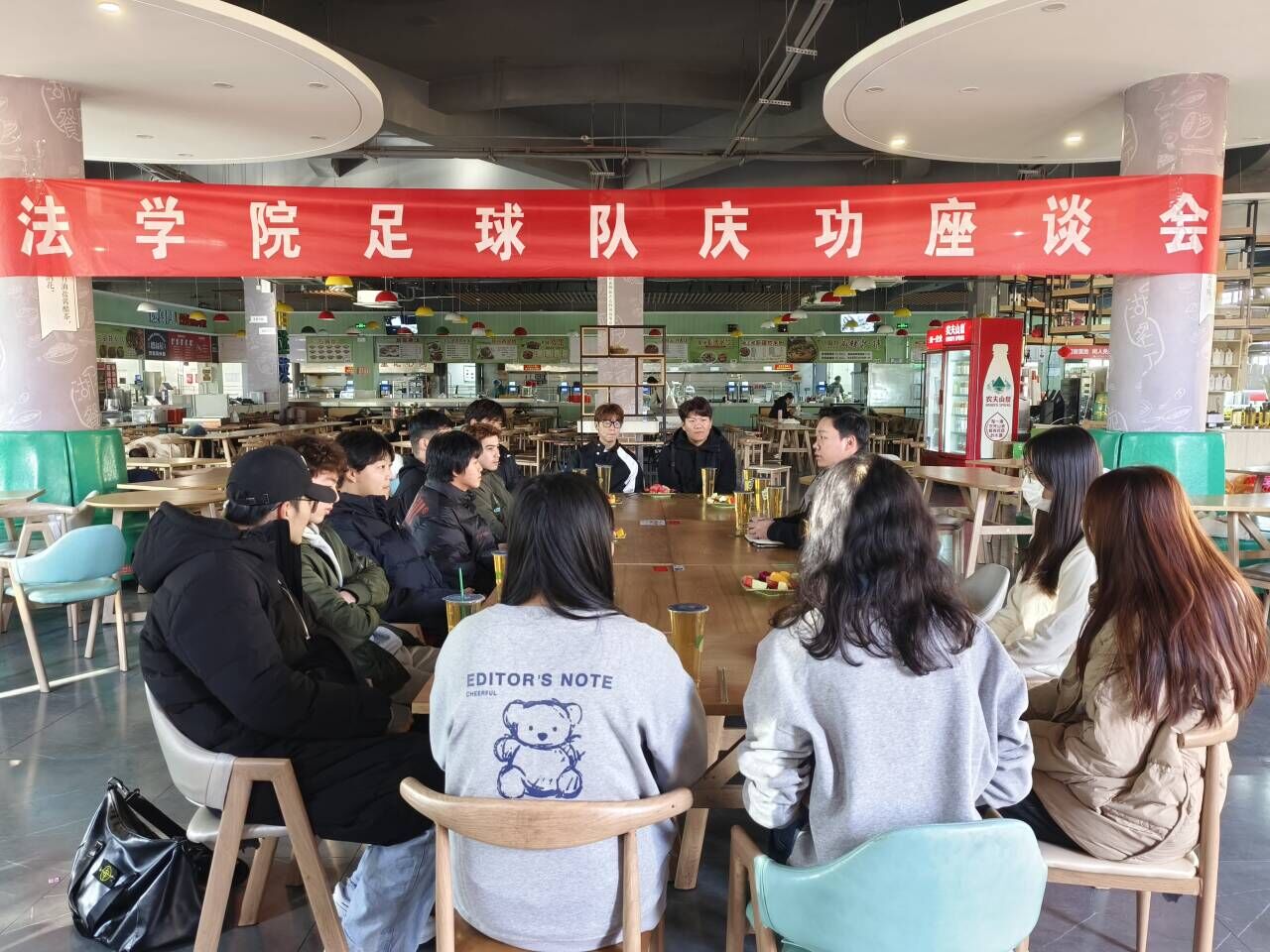 为庆祝法学院足球队斩获聊城大学第九届足球联赛乙组冠军,鼓励法学院足球队再创佳绩,11月23日,法学院于西校区湖苑餐厅二楼举办法学院足球队庆功餐厅沙龙座谈会,法学院辅导员孙曦出席此次座谈会,法学院2021级、2022级、2023级部分学生参加此次座谈会。