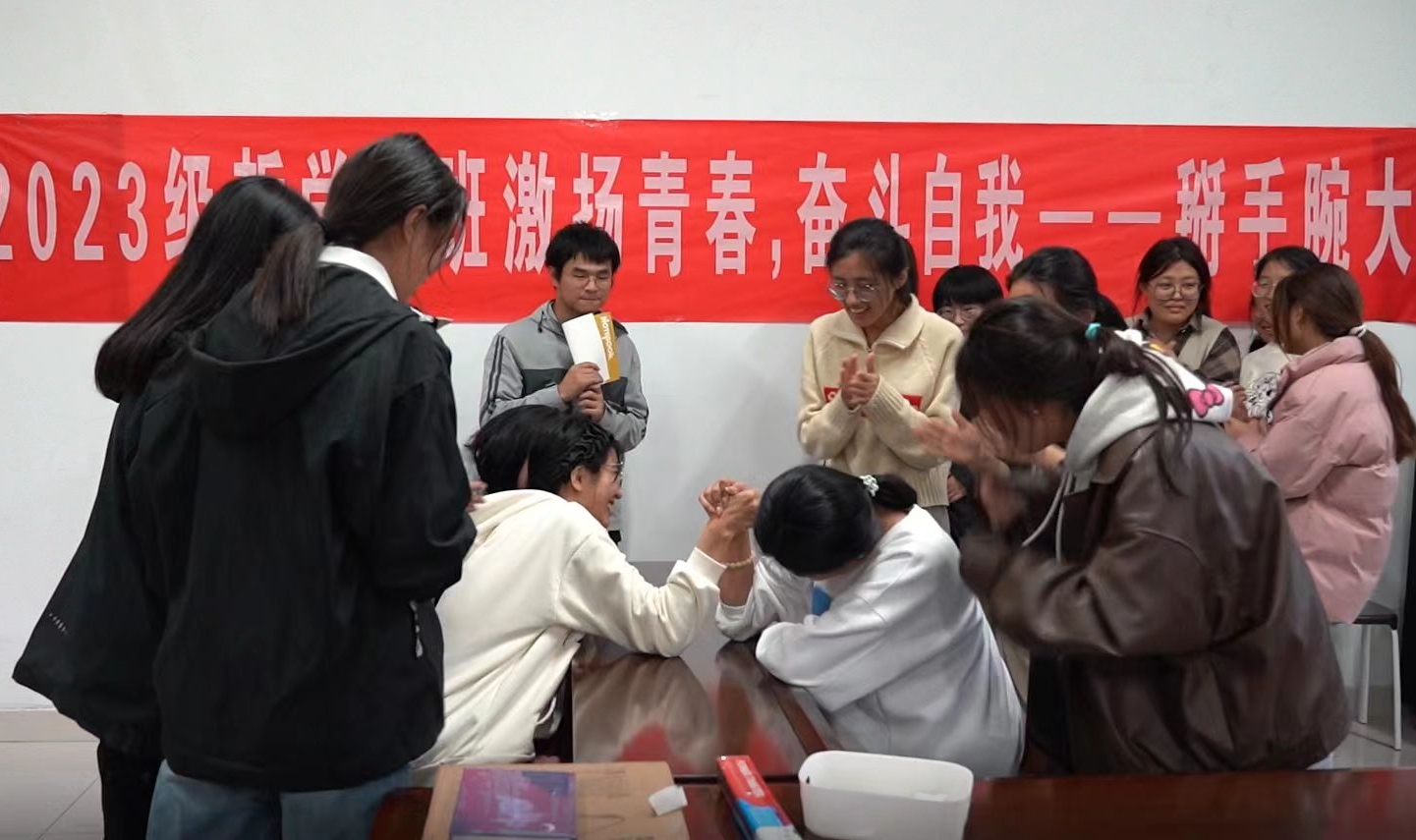 为丰富大学生的校园生活、缓解学习压力,增强体质,11月24日,政治与公共管理学院2023级1班团支部于东校区6#C101举办“激扬青春,奋斗自我”掰手腕大赛,2023级1班班主任许利、樊立蒙和政治与公共管理学院团委书记于进,以及2023级1班全体学生参加。