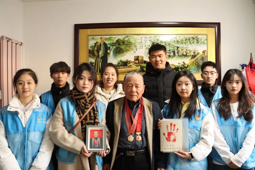 为了留住英雄的光辉形象,音乐与舞蹈学院志愿服务队为王明亮爷爷准备了一份特殊的礼物,现场进行肖像照拍摄。王爷爷戴上他的奖章,在镜头里透出来坚毅的神情,虽然89岁高龄,但戴上奖章的他依然坐的笔直。随后,肖像照现场打印出来,队员们将照片放入准备好的相框里,送给了王爷爷。同时为了传承王爷爷的红色精神,志愿服务队还准备了印泥、记号笔、卡纸等,为王爷爷留下了他的手印,王爷爷对服务队的同学们亲笔写下了:好好学习,天天向上这一美好祝愿。