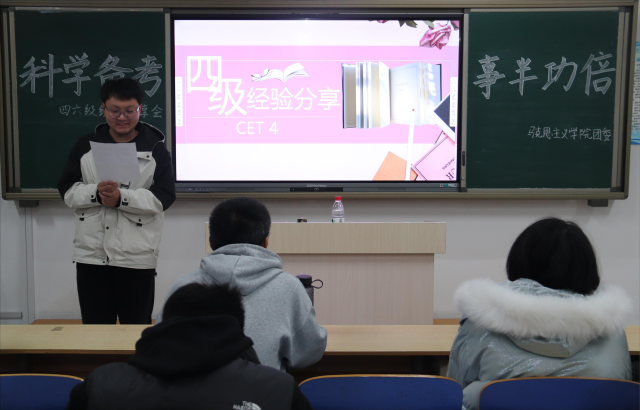 为向同学们提供实用的学习经验和备考策略,调动同学们学习英语的兴趣,12月1日,马克思主义学院在东校区6#A201教室举办“科学备考,事半功倍”英语四六级经验分享会,优秀学生代表杜俊、马诗妍担任主讲人,2023级部分同学参加。