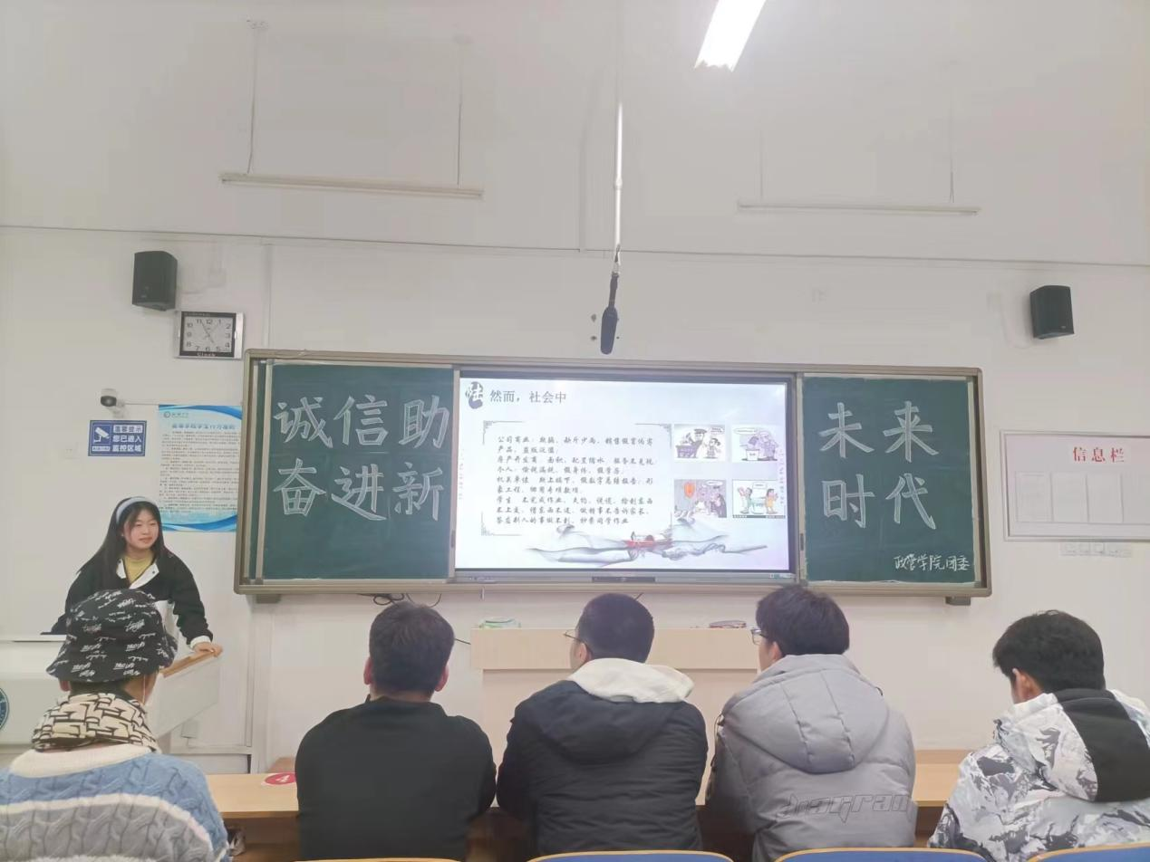 为帮同学们树立诚实守信的意识,促进校园的诚信建设,12月14日,政治与公共管理学院于C#204举办“诚信助未来,奋进新时代”思想成长活动。