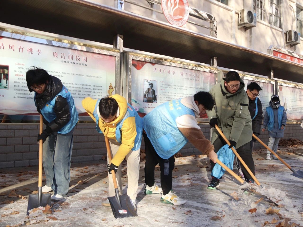 近日气温骤降,降雪寒潮叠加,道路积雪结冰,对交通出行产生较大影响。为减少安全隐患,确保校园道路通畅,保障师生出行安全,12月17日,文学院开展校园清雪志愿活动。