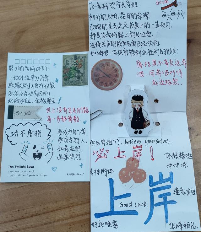 一句祝福,一语鼓励,化作奋笔疾书的动力。2023级2班华龙钰用不同颜色笔触与不同风格字体装点明信片,精美饰品寓意美好、满含期许,祝福考研学子“一战成‘硕’”,为考研学子增添勇气与动力。2023级3班张莉芸用绘画、贴纸等形式点缀明信片,言语生动活泼、鼓舞人心。她为考研学子夜以继日的努力点赞,为他们孜孜不倦的态度喝彩,字里行间蕴藏美好企盼。2023级5班王晴将暖心鼓励汇聚于一封书信,言语中饱含浓浓关爱与真挚关怀。她设身处地,推心置腹,希望考研学子劳逸结合,保持身心健康,以最好状态迎接考试。2023级5班时婧怡言辞恳切,字体优美,真诚祝愿考研学子在求学旅途中收获成长,塑造坚韧品格,磨炼坚强意志。2023级6班张明慧为考研学子书写贺卡,字体端庄流利,话语铿锵有力,承载温情祝愿。她鼓励考研学子锚定目标,挖掘动力,实现人生理想。手写礼物汇聚浓浓情谊,在严冬中注入微光与暖心。
