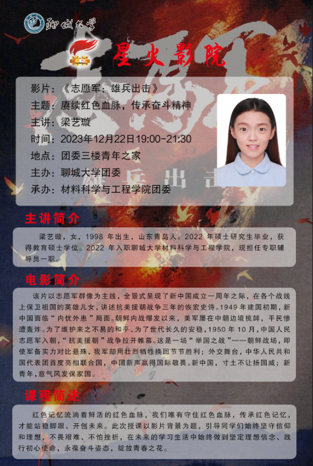 品读红色故事,筑牢理想信念。2023年12月22日,聊城大学材料科学与工程学院于东校区辰晖楼青年之家举办“星火影院”观影活动。本次活动观看的影片为《志愿军:雄兵出击》,特邀材料科学与工程学院辅导员梁艺璇老师担任主讲嘉宾。