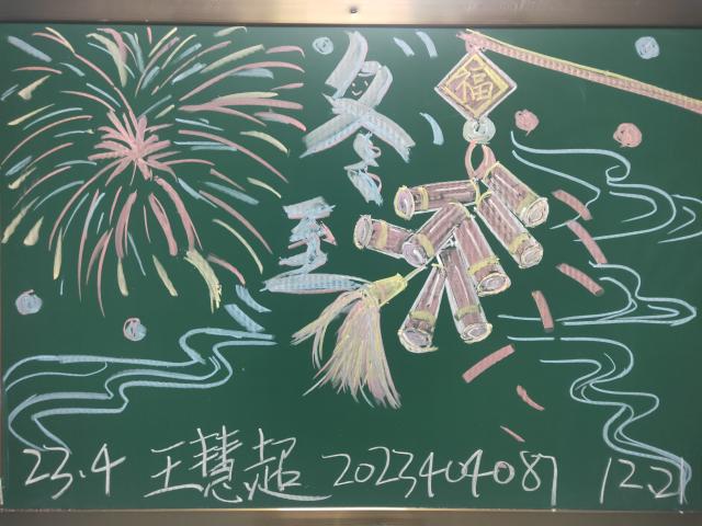 冬至是中国传统二十四节气之一,蕴含着古代劳动人民的智慧,是中华传统文化的重要载体之一。活动开始后,同学们在网络、书本中了解冬至的传统习俗,寻找创作灵感,收集素材。他们从冬至习俗、节日文化多个角度出发,根据自己的创意和想法,用手中的粉笔搭配多样的色彩,在黑板上绘出自己心中的冬至盛景。水饺,雪人、冰糖葫芦等众多冬至的象征被同学们所采用,原本单调黑板上浮现出一幕幕和谐的冬至景象。同时,同学们还运用各具特色的艺术字在黑板上书写冬至的习俗,谚语以及祝福语,节日气息扑面而来。其中,陈凯杰同学以冬雪为灵感,用纷飞的雪花传递冬至到来的消息,梅花、松树与雪人在雪中共同庆祝冬至的来临,让人感受到节日的欢乐。经过评选,焦宇佳、陈凯杰同学荣获一等奖,孟鑫斐、张宇等同学获得二等奖,王慧超、依布迪尼扎尔等同学获得三等奖。