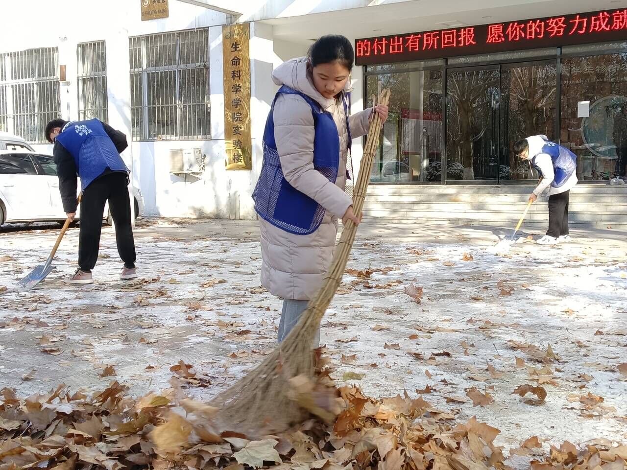 12月14日,聊城迎来大范围降雪,纷纷扬扬的雪花把校园装点成一个银装素裹的世界,同时也给师生的出行带来了极大的不便。基于此,同学们本着“全心全意为人民服务”的宗旨,踊跃报名参加此次活动。活动伊始,任庆超呼吁同学们弘扬“奉献、友爱、互助、进步”的志愿者精神,破冰前行,为建立安全美丽校园贡献一份力量。扫雪破冰过程中,同学们干劲十足,手持扫帚、簸箕、铁锨以及锄头等工具,奋力破冰除雪,尽管手和脸都冻得通红,却丝毫没影响同学们的劳动热情。同学们共同努力,认真负责,充满干劲,三人一群、两人一伙,扫积雪、铲冰层、清杂物,有的在前面扫除积雪,有的在后面奋力铲冰,干得热火朝天,教学楼和实验楼前主干道上的积雪和冰块很快被铲除并集中堆放。经过一个多小时的辛勤劳动,同学们为师生开辟出了一条温情的道路,同学们的精彩表现体现出新时代大学生团结奋进、担当有为的精神风貌。活动结束后,同学们纷纷表示,在此次志愿活动中自己感悟到奉献精神和劳动的快乐,在此后也会继续发扬勤奋务实、团结协作的精神。