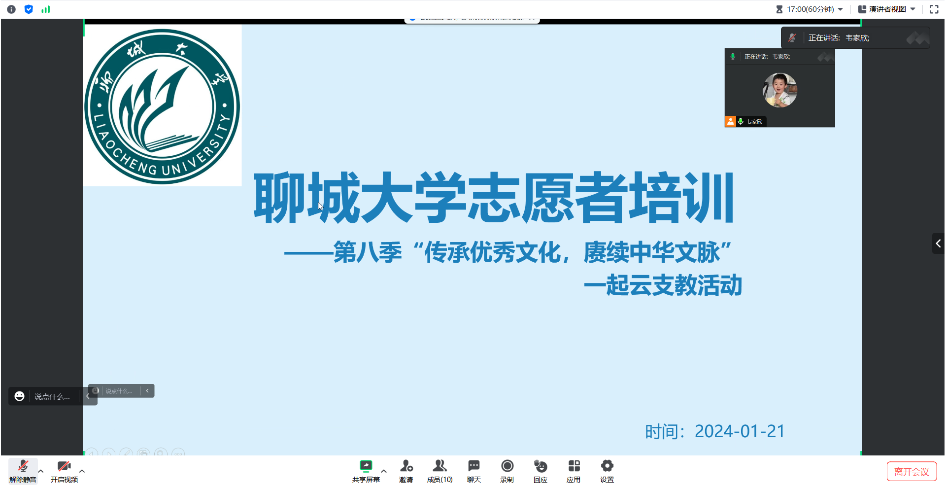 通过此次线上专项实践培训,志愿者进一步了解了“云支教”的基本流程与活动内容,在激发志愿者完成云支教活动的热情与决心的同时,引导志愿者锻炼本领,磨炼心性,提高交流能力,增强社会责任感,使其在活动期间更好地传承优秀文化,在赓续中华文脉中积蓄青春力量,彰显青年担当。