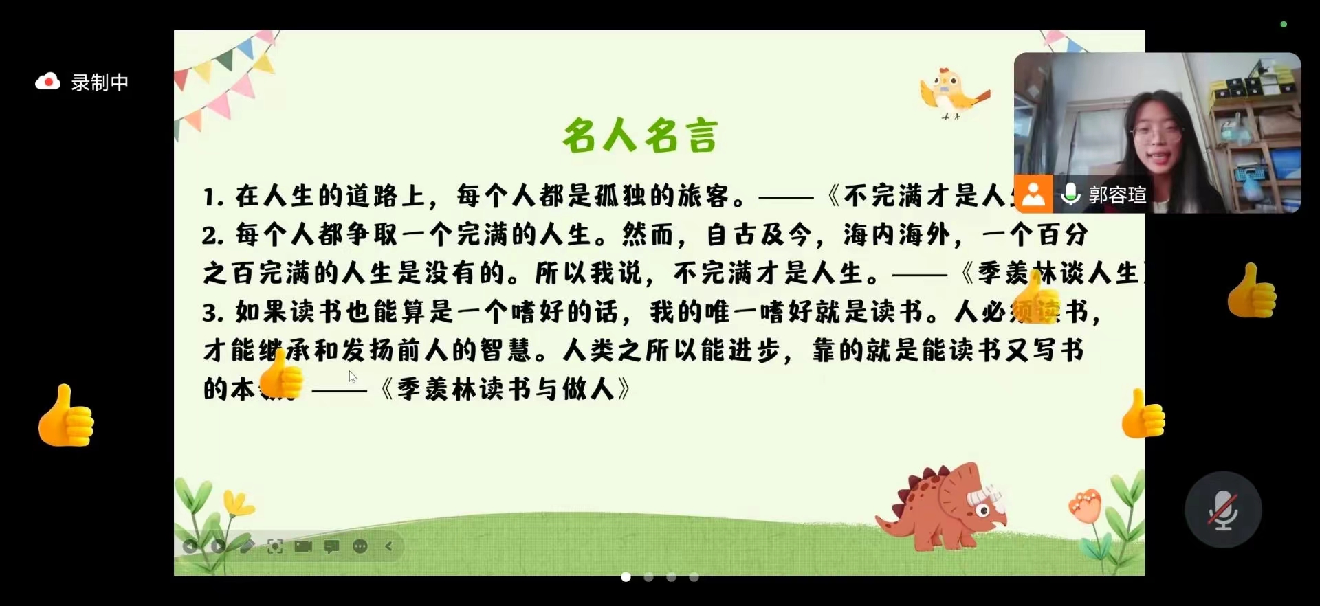 活动准备阶段,团队成员积极联系鱼山镇中心小学相关负责老师,对活动相关事项进行确认;同时,团队成员开展线上培训,按照分工安排认真备课,为保质保量地开展此次活动做好充分准备。活动期间,队员们以云课堂为载体,精心为鱼山镇中心小学的同学们开设思政课、国学课等特色课程,重点讲述身体健康教育的重要性,积极教导同学们养成健康良好的学习和生活习惯;同时,队员们还对楹联的发展历程等基础知识进行讲解,并通过展示有趣的楹联事例,来加深同学们对楹联文化的理解、记忆和感受,并鼓励同学们进行自主创作。此外,团队成员带领同学对剪纸、绘画和书法三方面内容进行学习,帮助同学们体悟中国传统艺术的无限魅力,进一步增强同学们的审美意识和艺术素养。活动后期,团队成员对支教结果进行反思和整理,总结活动经验,并为同学们送去真挚的祝福。