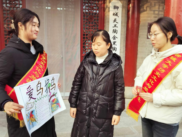 为激发群众们对大自然的热爱,提高群众对鸟类保护的关注度和参与度,1月13日,历史文化与旅游学院于聊城市古城社区举办“守护蓝天精灵,守护美丽生态”活动。