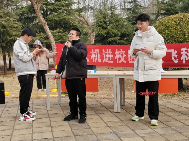 活动负责人提前到达活动现场布置无人机飞行场地,为活动的顺利进行做好准备。无人机讲解员从无人机飞行的原理、无人机的基础构造、无人机的分类应用等方面一一做了深入细致的讲解,向同学们讲述无人机在农业飞行、航拍、空中警察等方面的应用,告诉同学们无人机在国防建设、应急救援、乡村振兴、绿色生态等领域发挥着不可替代的作用。讲解员还向同学们展示无人机的基础构造,并现场示范如何使用无人机。同学在解说员的悉心指导下依次上手体验无人机飞行的乐趣,开始现场学习如何操控无人机。在试验飞行过程中,同学们不时向解说员询问操控技巧,还在讲解员的鼓励和指导下完成较高难度的无人机飞行任务,成功操控无人机完成起飞、避障等动作。同学们亲身体验操控无人机,近距离感受科技的魅力,纷纷表示期待下一次“无人机进校园”活动的开展,对无人机的飞行体验充满了热情。