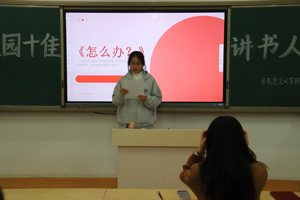 参赛选手们通过抽签的形式决定自己的上场顺序,分享自己精心挑选的书目,向在场的观众传递书中的智慧和魅力。他们根据自己独特的理解和感受,为讲书内容配上合适恰当的配乐,为观众带来更加丰富多样的视听体验。其中,马晓燕从作者简介、写作背景与主要内容三个方面为大家讲解《怎么办》,解释党的“先锋队”功能,分析知识分子和意识形态在革命中的作用,为大家展现了马克思主义革命理论的重要性。李雨桐老师秉持公平公正的原则,以讲书内容、语言表达、讲书效果、仪态风格以及综合印象等五部分作为评分标准,对参赛选手进行打分。经过激烈的角逐,最终选出一、二、三等奖。