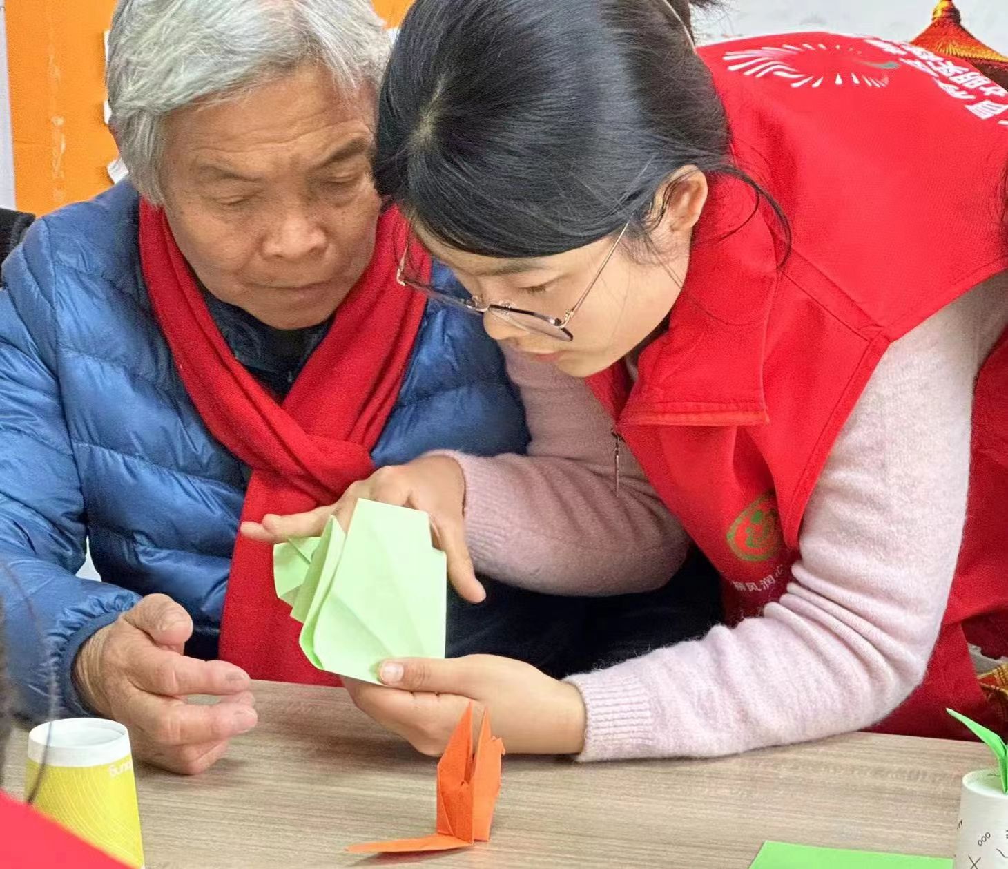 紧接着,志愿者带领老人学习折纸——千纸鹤和百合花。在学习过程中,志愿者们在旁边随时提供帮助,使老人按照正确的步骤和折法折纸。千纸鹤栩栩如生,百合花俏丽芬芳。老人们的学习热情高涨,争相向志愿者讨教折法。志愿者们悉心解答疑惑,耐心展示折法,确保每个老人都能完成折纸。
