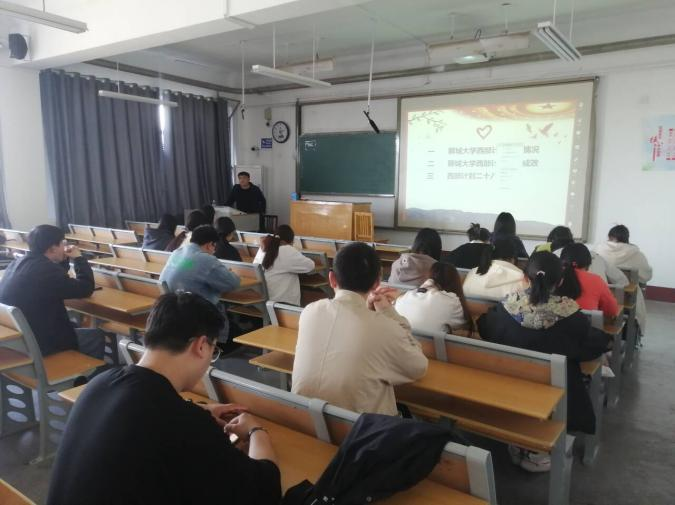 张珍军老师系统地向同学们介绍了西部计划的主要服务内容、报名方式及相关政策等,他讲道西部计划是一个大学生志愿服务活动,通过参加西部计划可以丰富自己的工作经验,同时又响应了国家号召,向西部欠发达地区工作、支教,为国家发展做出贡献。随后,张珍军老师聚焦于同学们的疑惑,细致地解答了同学们提出的问题。