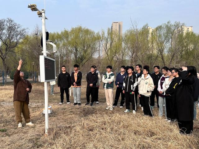 在讲解员的带领下,同学们参观了日晷广场,了解了日晷的结构组成与工作原理,体会了古代人民无穷的智慧与丰富的创造力。讲解员介绍了植物园中的科研级气象站、百叶箱、太阳辐射自动监测站等设备,使学生能够近距离观察地理仪器的运作方式,增进对地理学习的理解和体验。