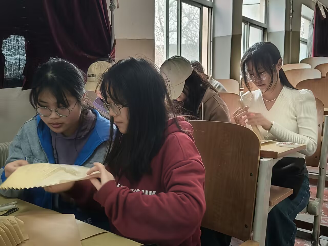 牛皮纸下灯亮起,手作体验暖意生。活动伊始,主持人播放视频介绍纸书灯的历史与制作方法,并为同学们发放材料。同学们亲自动手,选取材料,交流想法,发挥创意,制作出一盏盏富有独特魅力和文化内涵的纸书灯。2021级1班潘春竹将传统中国元素与山水国画元素结合,又以精致的流苏和翩翩起舞的蝴蝶作为点缀,展现出国风版纸书灯的如诗如画。2022级2班刘奕彤将传统中国扇子元素与中国诗词结合,又以大雁贴纸作为点缀,展现出国风扇形书灯的美轮美奂。2022级3班王慧琳将王羲之的《兰亭集序》写入书灯,一笔一画,挥毫泼墨,将蝴蝶、古风贴纸作为装饰,通过对折、剪裁、粘贴等步骤,让蝴蝶与光影跳动于书灯之上。2022级6班高晓雪将中国汉字与灵动的蝴蝶相对应,让汉字与蝴蝶跳跃于纸张之上。点亮书灯,带来的不仅是明亮与温暖,更是中华优秀传统文化的传承与延续。