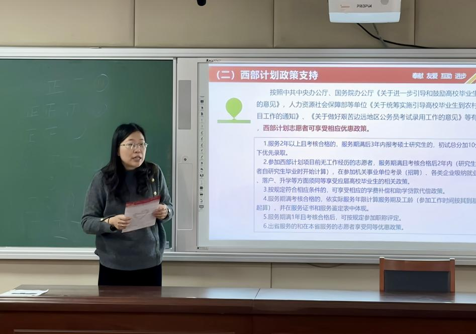 为积极响应团中央的号召,切实做好大学生志愿服务西部计划宣传工作,引导广大青年学子深入了解西部计划项目、投身基层建设,3月28日,传媒技术学院于11#C401举办2024年第一期“服务西部,成就未来”西部计划宣讲会。传媒技术学院团委书记刘妙祎担任此次宣讲活动的主讲人,学院2024届应届毕业生等部分学生参与此次活动。