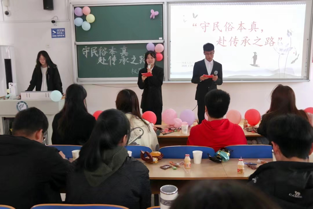 扬民俗之风,展青春年华。为响应学校学习民俗文化号召,增强同学们对民俗文化的理解和认识,提高同学们思想道德素质和文化修养,3月28日,历史文化与旅游学院于6#A503教室举办“守民俗本真,赴传承之路”民俗文化决赛。