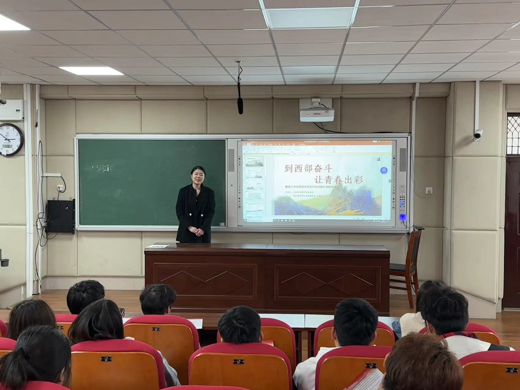青春无悔付西部,壮志凌云展宏图。宣讲过程中,王晶晶就西部计划是什么、西部计划的服务内容、全国项目服务及选岗情况等对西部计划服务的政策和内容展开解读。她详细地为同学们介绍了当前西部计划项目的基本情况、招募范围、政策待遇与选拔流程,帮助同学们初步了解西部计划。随后,王晶晶又以图片和视频的形式向同学们分享了她在陕西富平的支教经历。她以自己的亲身经历带领学生们走进真实的支教生活,让他们感受到西部计划的独特魅力和深刻意义。她表示,读万卷书,行万里路。投身西部计划既可以满足大学生的就业需求,又能积累丰富的基层工作经验。希望同学们抓住机会,踏上西部计划之旅,响应国家号召,在祖国广袤无垠的土地上挥洒青春热血。活动最后,王晶晶针对同学们对西部计划提出的疑问进行了耐心解答。活动结束后,同学们纷纷表示,通过此次宣讲活动,他们更加深入地了解了西部计划的政策优势,同时也坚定了去西部挥洒青春汗水的信念与决心。