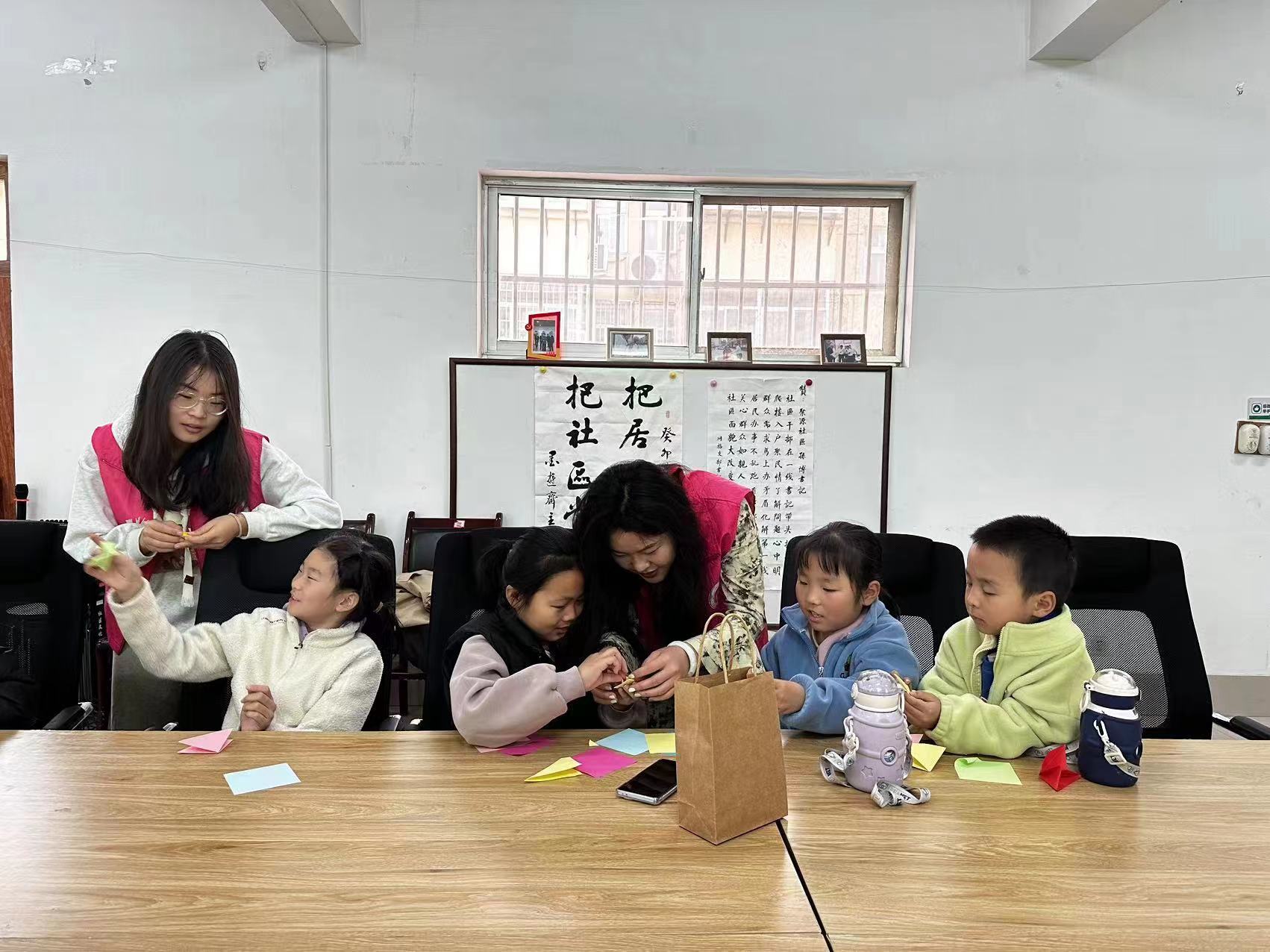 活动伊始,志愿者提前询问小朋友们对植物种类的了解程度,在此基础上向他们介绍了不同植物的类别,普及了植物拓染的起源和传承。结合图片,志愿者向小朋友介绍了春天的花朵集并依次介绍不同花朵的特性和开花时限。随后,志愿者组织小朋友们进行折纸游戏,借纸张留下春天的痕迹,感受春天的勃勃生机。在手工制作过程中,志愿者耐心讲解折纸的技巧,鼓励他们结合春天的特征,自由创作。孩子们笑声阵阵感受着各种手工制作过程。志愿者手把手教孩子们制作出一个个富有创意又精美的作品,看着亲手制作的作品,小朋友脸上洋溢着幸福和自豪的笑容。活动最后,志愿者带领小朋友们一起学习歌曲《桃花朵朵开》。跟随着欢快的音乐节拍,小朋友们伸出双手,有节奏的拍打桌面,声音整齐有序,整个活动室洋溢着欢乐的氛围。春雨滋润大地绿,春风吹拂水波清。