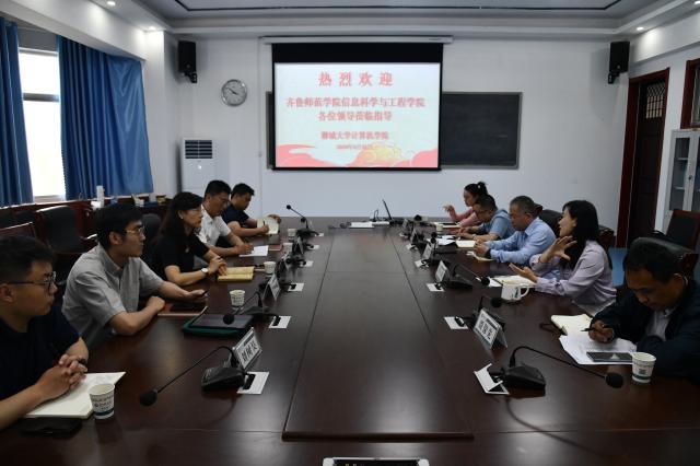 4月26日,齐鲁师范学院信息科学与工程学院党委书记赵青、院长杜建彬一行五人来计算机学院调研交流。学院党委书记贾仰理,院长桑红燕,副书记杨磊、副院长贾保先,团委书记张雪在西校区10号楼A408会议室同来访客人进行座谈交流。