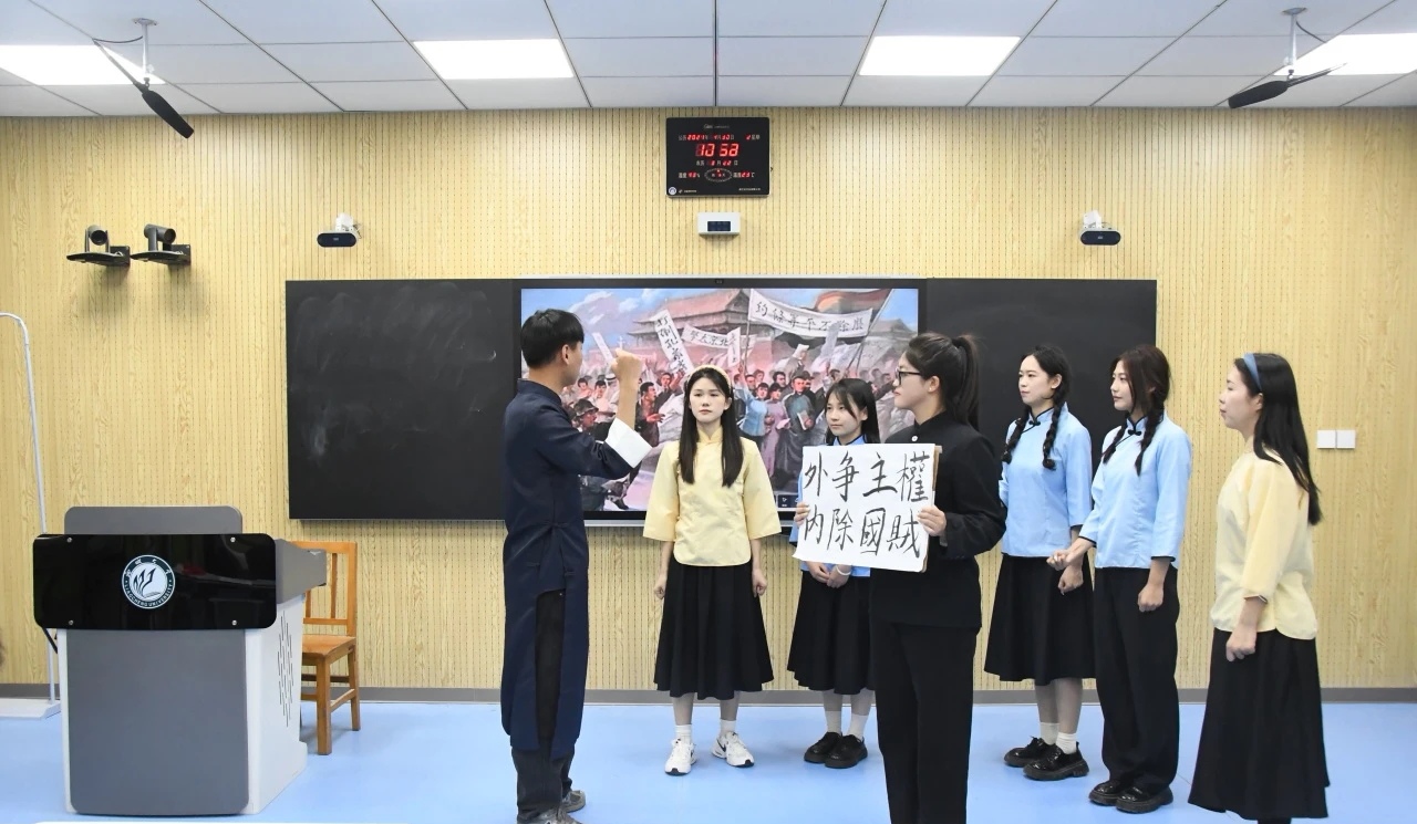 《破晓》思政课程剧以五四运动为历史背景,通过沉浸式的教学模式,让同学们深入了解并体验了那段波澜壮阔的历史。课程剧融合了朗诵、表演、合唱等多种艺术表现方式,将五四精神生动地呈现在观众面前。在剧中,同学们扮演了不同角色,无论是热血的学生、坚定的知识分子,还是勇敢的爱国人士,他们都用自己的方式诠释了五四精神。他们深情朗诵,激情表演,合唱出青春的旋律,展现出对国家的热爱和对未来的憧憬。