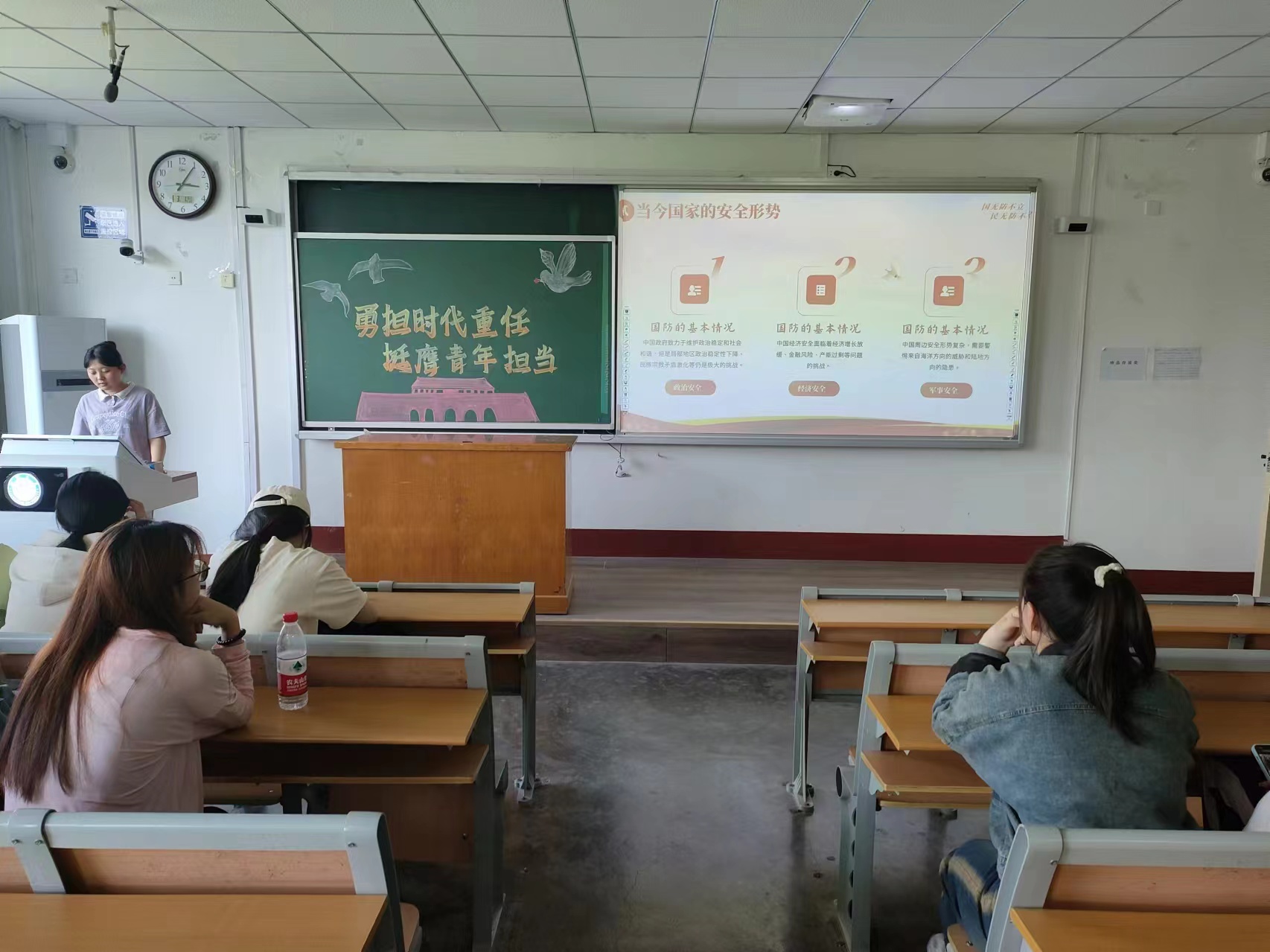 活动伊始,主讲人张新玥同学以满腔的热情和深厚的专业知识,为在场的同学们带来了一场关于青年国防教育的职能和作用的精彩演讲。她以国防的主要意义为起点,深入浅出地阐述了国防对于一个国家的重要性,使同学们对国防有了更为深刻的理解。接着,她结合当今国家的安全形势,从科技创新、人才培养、国际合作等多个角度,详细剖析了国内外环境的复杂性和多变性,全面展现了增强国防力量的重要性和紧迫性。在演讲的高潮部分,张新玥同学用深情而激昂的语调,讲述了陈祥榕烈士和杜富国战士的英勇事迹。他们面对生死考验毫不退缩,为了国家和人民的安全的勇于奉献的故事让在场的每一位同学都深受触动。演讲结束后,同学们纷纷走上台前,分享自己的心得体会。李浩然同学感慨道:“通过这次活动,我更加坚定了自己的理想信念。我意识到,作为新时代的青年,我们不仅要追求个人的成长与进步,更要时刻牢记国家和人民的利益,将个人的梦想与国家的发展紧密结合起来。”