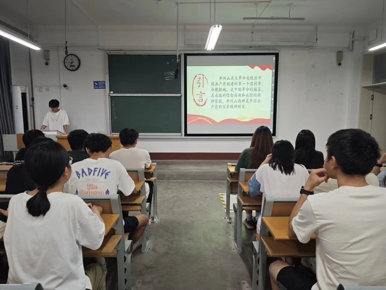 本次活动从井冈山意义的阐释,井冈山故事,井冈山精神的内涵等几个方面进行讲解。首先,主讲人用生动的语言和丰富的图片资料,对同学们阐释了井冈山精神的重大意义。井冈山精神铸就了共产党的伟大革命精神,是引导中国革命走向胜利的宝贵精神。接着,主讲人讲述了革命先烈们在井冈山时期的艰苦生活和英勇斗争,表示他们这种行为正是井冈山精神的集中体现。在井冈山精神的内涵讲解中,主讲人从不同的角度对其进行了详细解读。主讲人结合历史事实和革命故事,详细阐释了井冈山精神中“坚定信念、艰苦奋斗、实事求是、敢闯新路、依靠群众、勇于胜利”的核心要义。最后,主讲人结合当今社会实际,阐释了井冈山精神在新时代的意义和价值,激励同学们要坚定信念、勇于担当、敢于创新。同学们也纷纷表示深受启发,并表示要大力弘扬井冈山精神,坚定理想信念,勇于作为。
