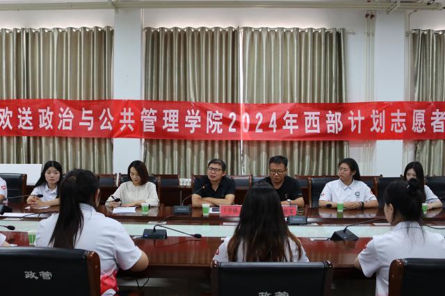 青春无问西东,奋斗自成芳华。6月13日,政治与公共管理学院于东校区6#C101召开2024年西部计划志愿者欢送会,学院院长于学强、党委副书记兼副院长乔华军、辅导员徐娜及2024年全体西部计划志愿者参与欢送会,会议由徐娜进行主持。