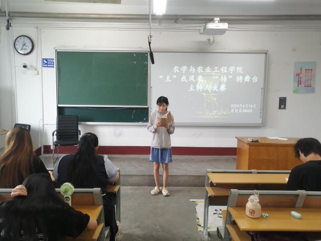 为丰富同学们的课余生活,提升大家的文化艺术素养,6月16日,农学与农业工程学院于东校区2#605举办“‘主’我风采,‘持’骋舞台”主持人大赛。