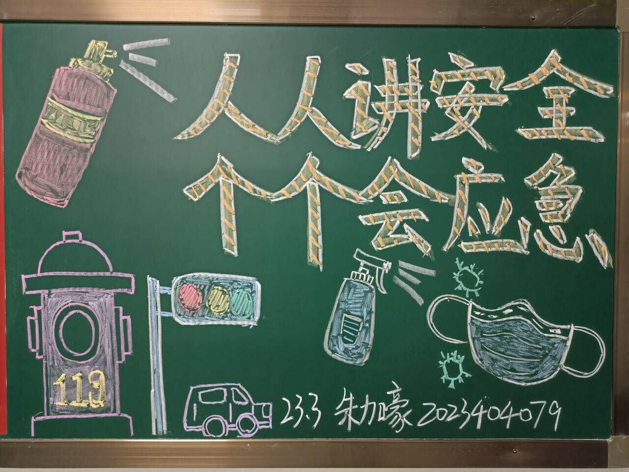 本次活动响应安全生产月“人人讲安全、个个会应急——畅通生命通道”的主题,利用黑板报的形式,宣传保持生命通道无阻碍、无易燃物等的必要性,并帮助师生快速掌握有效的应急知识。活动过程中,同学们提前了解生命通道的重要之处以及生命通道堵塞的危害,并通过图文结合的方式进行宣传教育。其中,李浩月同学聚焦”安全应急”字眼,充分利用红绿灯、火种和灭火器等多个要素,组合“119”的消防号码,使得板报整体思路清晰,传递出车辆出行要观察路况;遇到紧急情况及时拨打119,并将车辆停放于应急车道,必要时使用消防用具进行紧急处理等信息。张腾飞同学的作品角度独特,以文字为主,以绿植、太阳为辅,鲜明地表达出守护校园安全,应以防范为主,以备不时之需的主题。活动结束后,同学们纷纷表示,“安全无小事,责任重如山”,未来将会从自我做起,学习防范措施,提高防范能力;从小事做起,将校园安全落到实处。