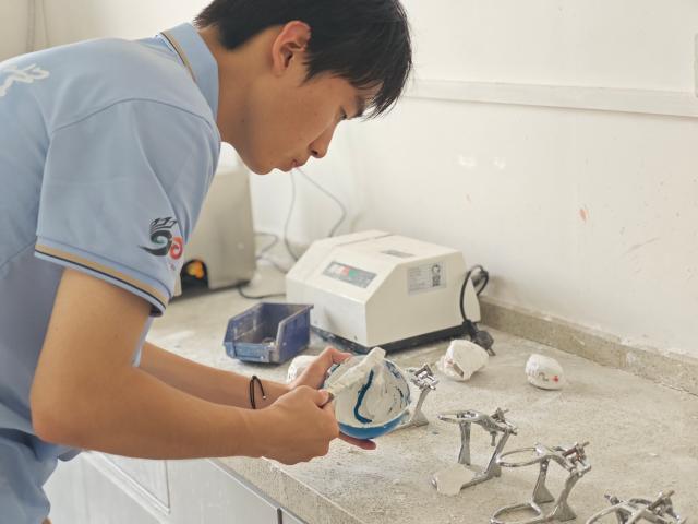 7月13日,服务队前往聊城市人民医院进行义齿的进一步制作,他们带着满腔的热情,投入到弯钢丝、排牙、做基托、打磨、去蜡、煮牙等一系列复杂的制作步骤之中,与医生们紧密配合,帮助医生完成五副高质量义齿的制作。义齿的制作过程将志愿者们从书本上的知识转化为现实操作,他们不仅学习到了专业技能,而且深刻体会到了制作过程的不易。
